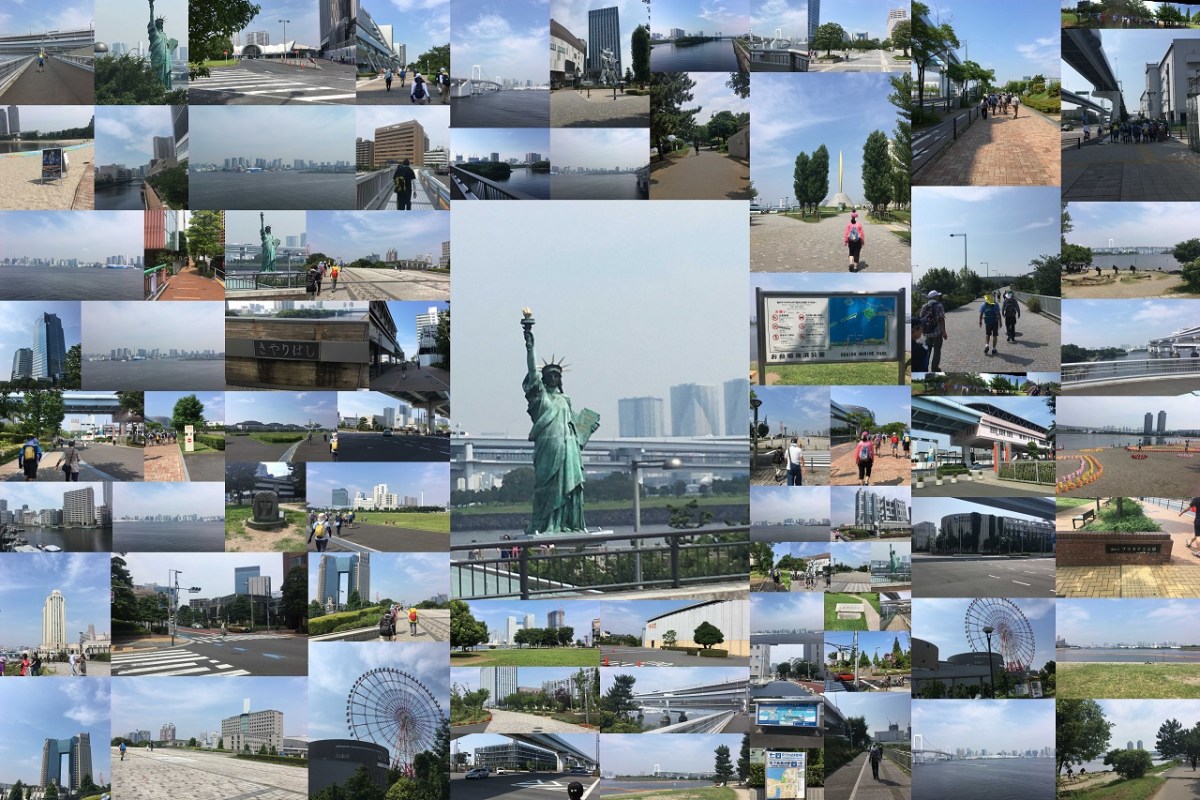 豊洲公園(スタート)→豊洲まちなみ公園→晴海大橋南詰→東京臨海広域防災公園→シンボルプロムナード公園(夢の大橋・セントラル広場・ガンダム像)→自由の女神像→お台場海浜公園→レインボーブリッジ→汐彩橋→JR田町駅東口(ゴール)